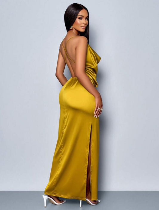 SHEIN- Robes moulante élégante en satin à col drapé sans dos et fente haute , couleur unie