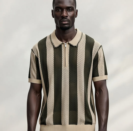 Polo rayé mesh oversize – Kaki & Beige