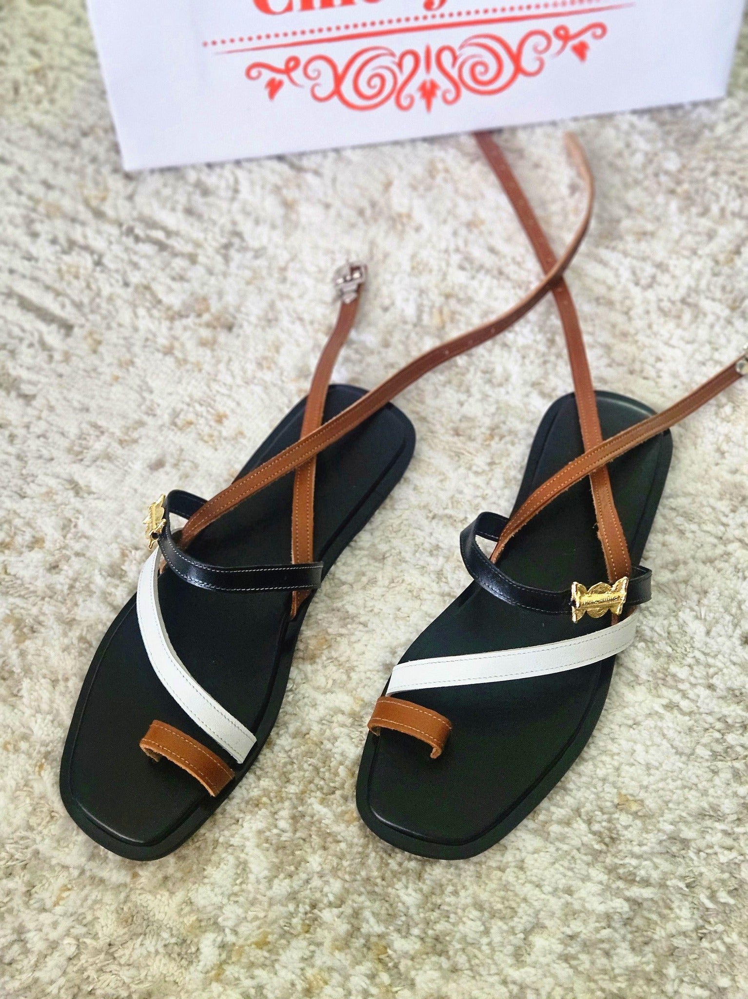 Superbes sandales plates pour femme, alliant style bohème et touche sophistiquée. Conçues avec des lanières fines en cuir souple multicolore (noir profond, blanc éclatant et camel chaleureux), elles offrent un design asymétrique croisé qui sublime vos pieds tout en assurant un maintien parfait.