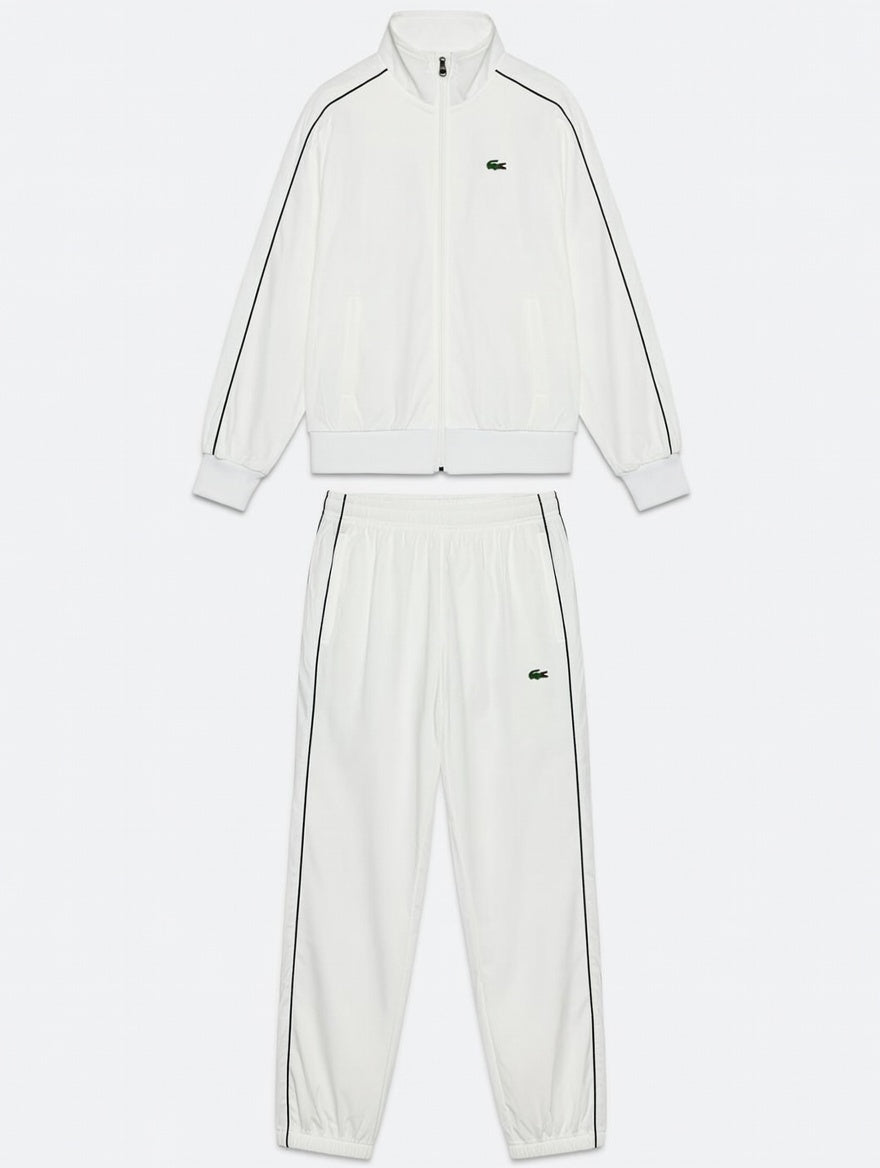 Veste zippée légère et pantalon jogging en tissu technique ultra-fin. Liserés noirs signature, crocodile brodé vert emblématique. Coupe moderne et confortable, style sportswear chic intemporel. Idéal pour le citywear ou l’après-sport.