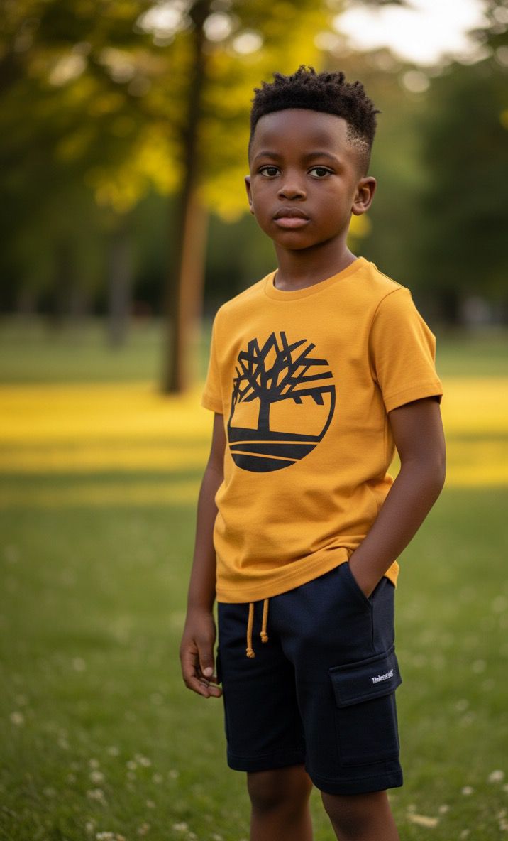 Ensemble timberland , tee shirt jaune avec logo en avant et short cargo .