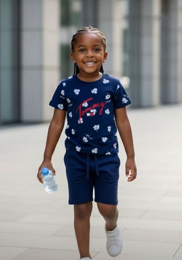 Ensemble Tommy bleu marine, avec haut Haut fleury et logo tommy en avant .