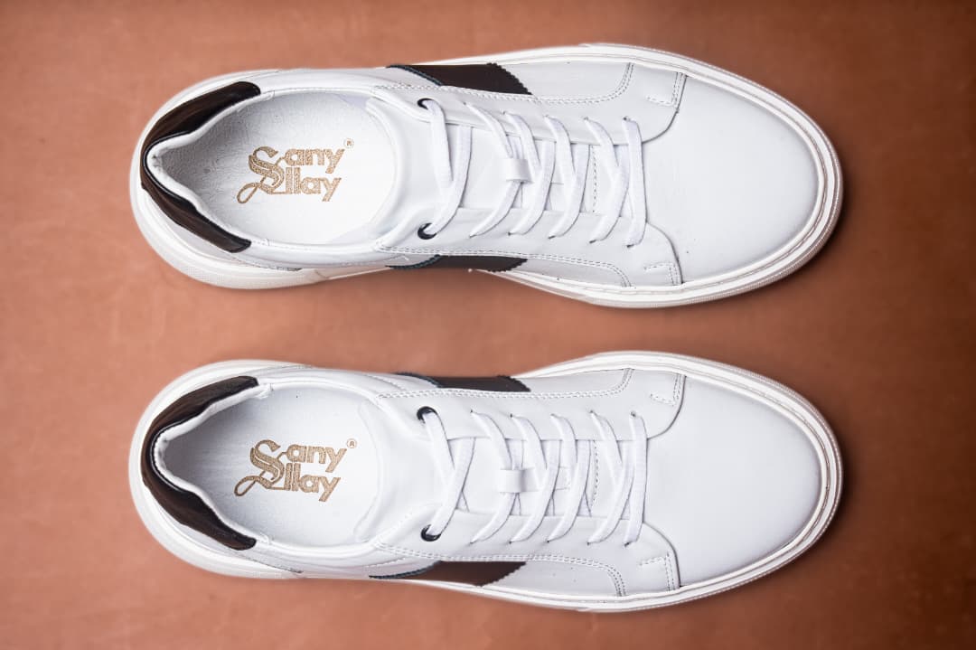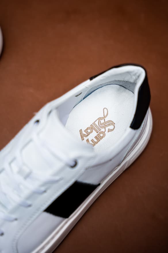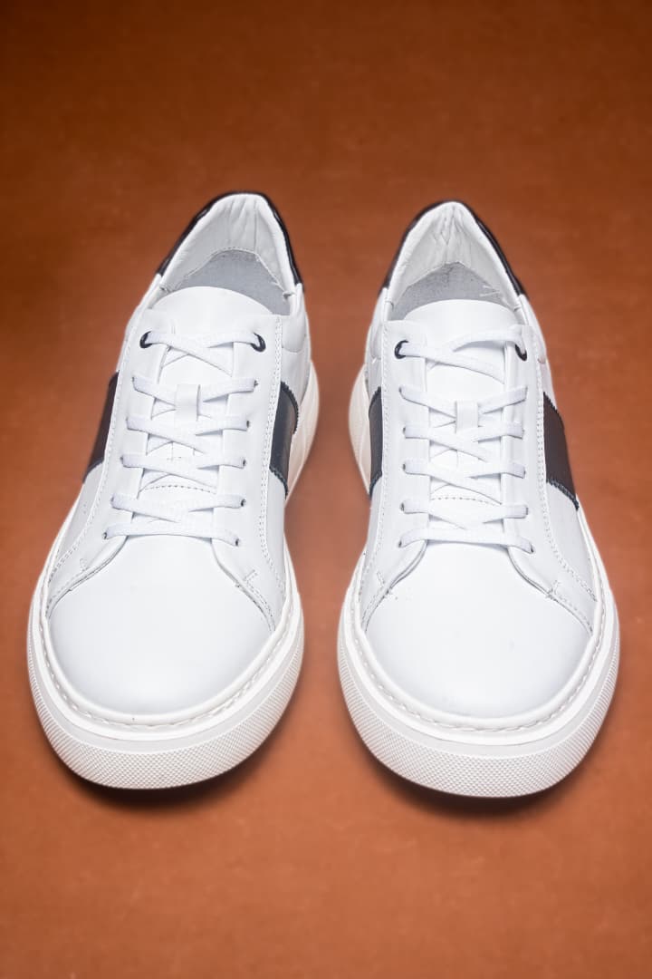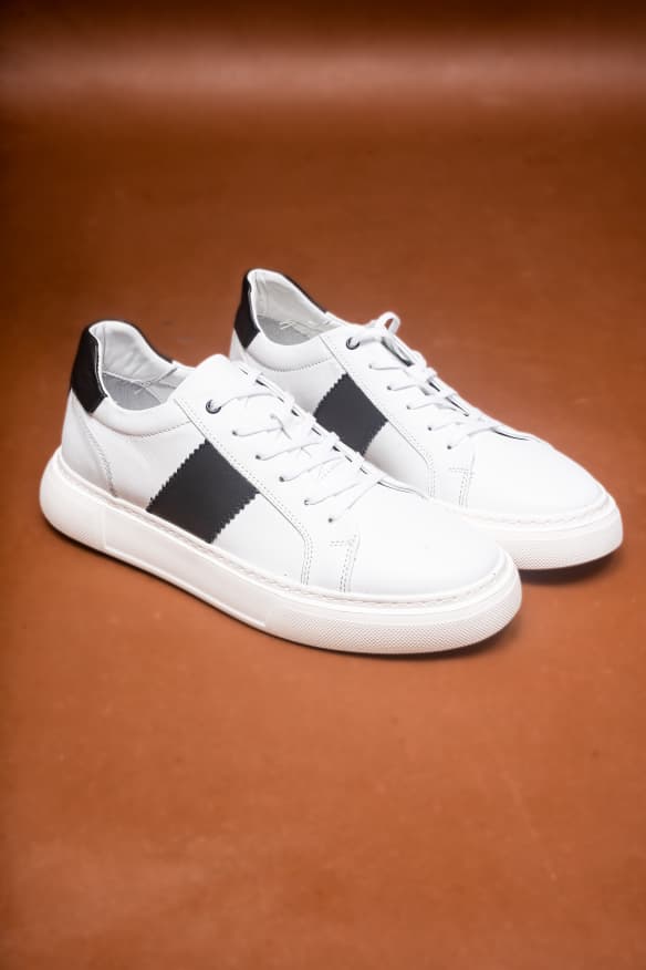 Baskets basses en cuir blanc avec empiècements noire pour une touche élégante. Semelle épaisse confortable, design épuré et moderne. Idéales pour un style casual chic, faciles à porter au quotidien.
