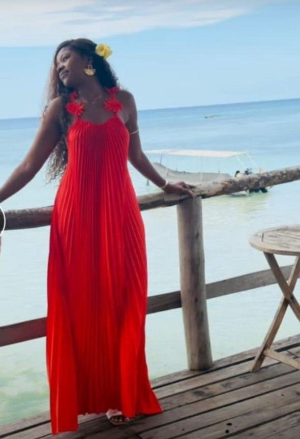 Robe longue plissée en tissu fluide, couleur rouge vif.