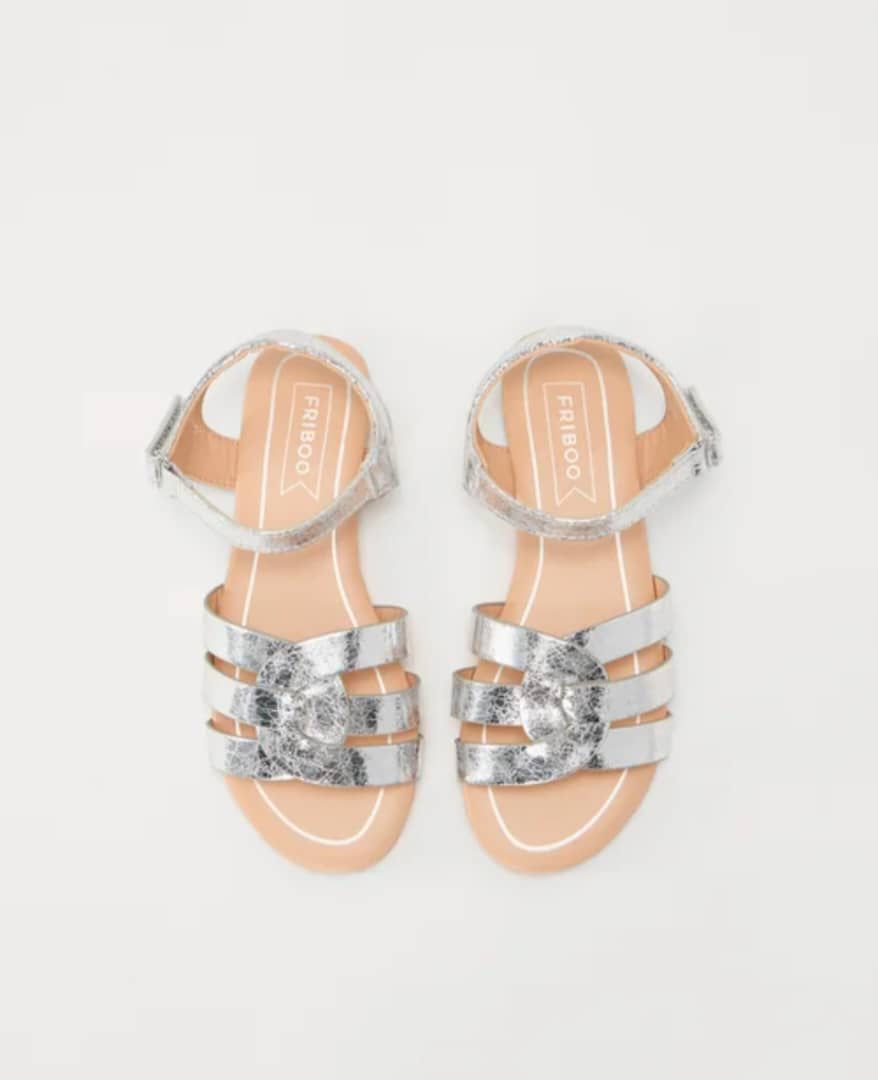 Sandales ouvertes en cuir synthétique métallisé argent avec brides croisées et fermeture velcro. Semelle souple et confortable pour les petites pieds. Parfaites pour les occasions festives.