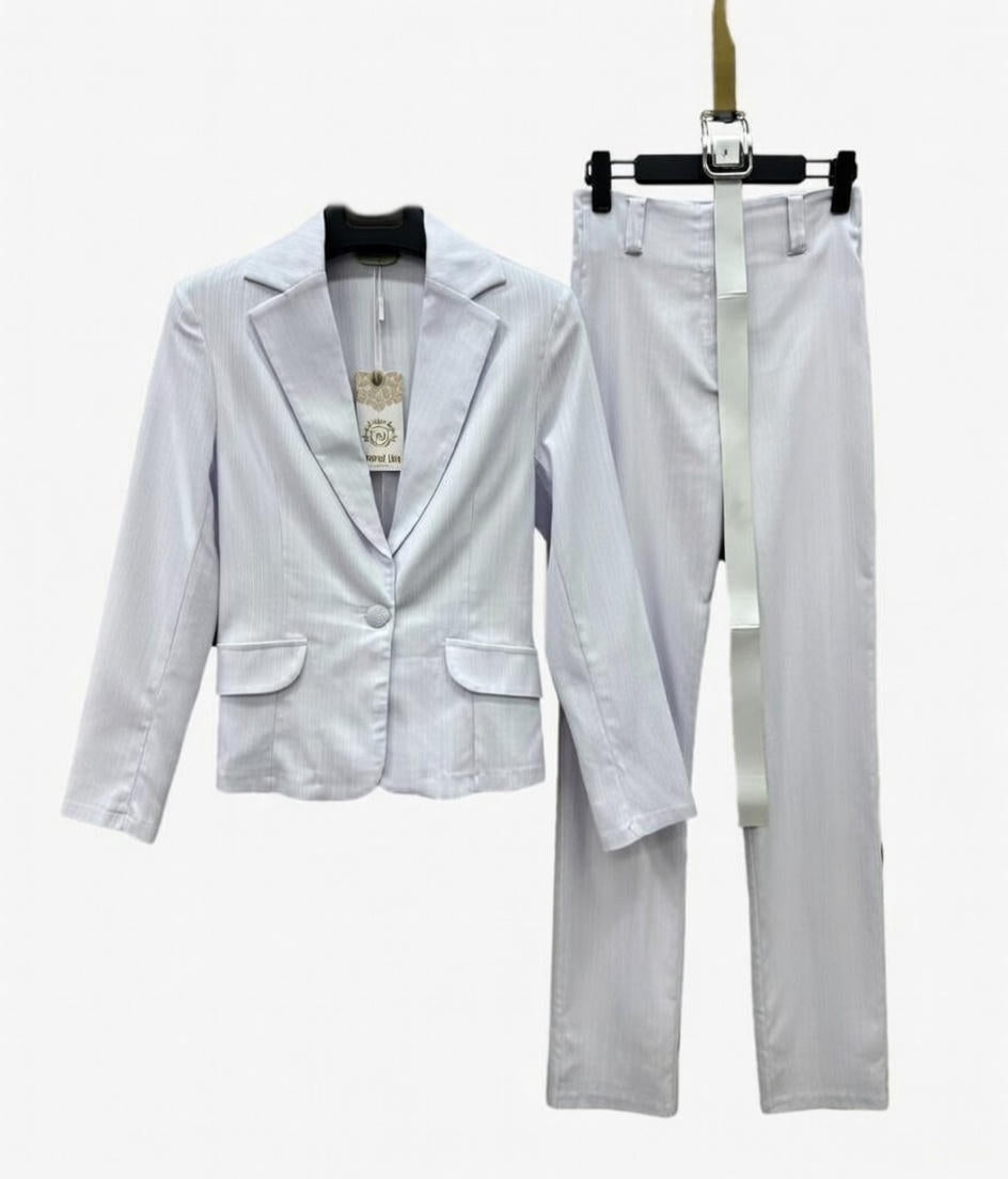 Ensemble 2 pièces veste croisée et pantalon droit. Ceinture assortie. Parfait pour un look épuré et lumineux, idéal en mi-saison ou pour des cérémonies.