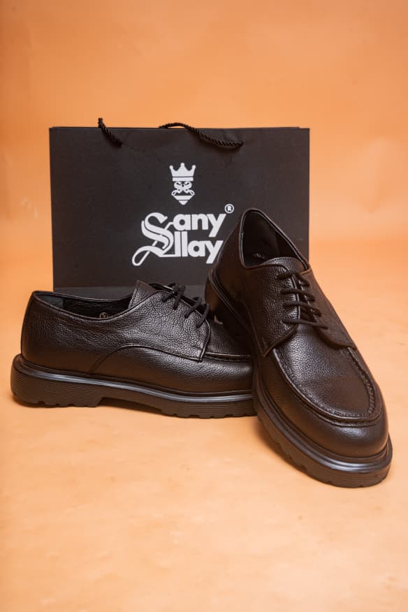 Chaussures derbies en cuir noir grainé, élégantes et robustes. Semelle épaisse confortable pour un usage quotidien, finitions soignées et style intemporel. Idéales pour un look chic au bureau comme en sortie.